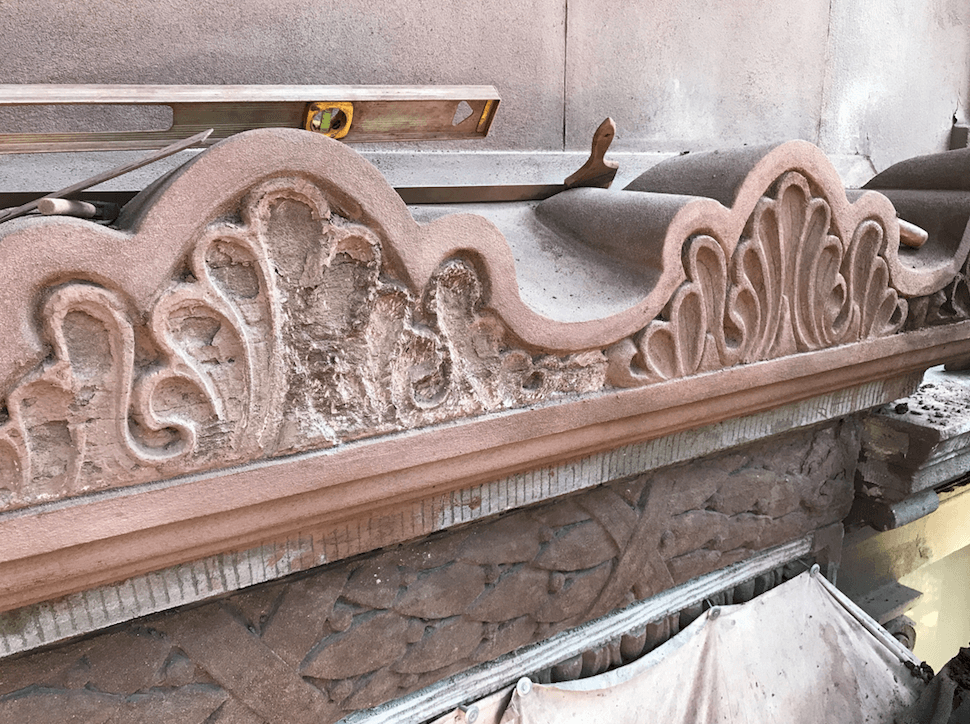 - originálne dentikuly a kordónové rímsy sa zamerali 3-D skenerom, chýbajúce kusy boli doplnené odliatkami zo spevneného vápennopieskového betónu;